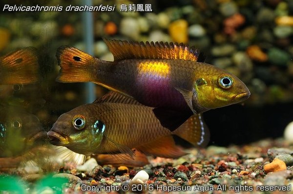 The most beautiful kribensis species out there. Also called the "Wouri cichlid" from the Wouri River in Cameroon. The female fires up BRIGHT yellow, black and purple. GORGEOUS FISH. And, easy to breed. So you can get rich fast!!!