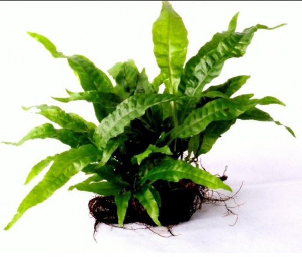 This is a miniature Java fern that grows no taller than 3 to 4 inches. It’s glued to a black lava rock.