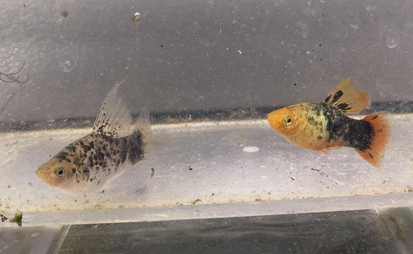Pair of high fin king lyretail platys, 1 male and 1 female. King lyretails are different from standard lyretails, as the former has a normal gonopodium and can breed regularly.