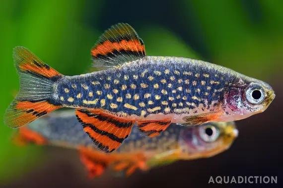 These tiny danios have silver spots on an grey-blue body and bright red-orange fins, especially on the males.