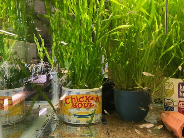 A repurposed soup mug with a large amount an unknown Vallisneria species, probably spiralis, grown in my fishroom. You are bidding on the large soup mug in the LEFT side of the photo that says Chicken Soup. This container is the same species as the other containers, but the stems in this one are a little more fine and more twisted. The other containers in the photos are in other listings. Use as-is or divide. The rootball easily slides out of the pot for replanting or dividing into additional pots. This species grows FAST in my hard water under LED shop lights without any supplements other than some occasional Flourish Excel to help keep algae under control, so it couldn't be much easier to grow. Nuisance snails are guaranteed to be included, any algae is incidental or there is none. The plants are coming from a 40 Breeder grow out tank with young non-spawning Rainbowfish.