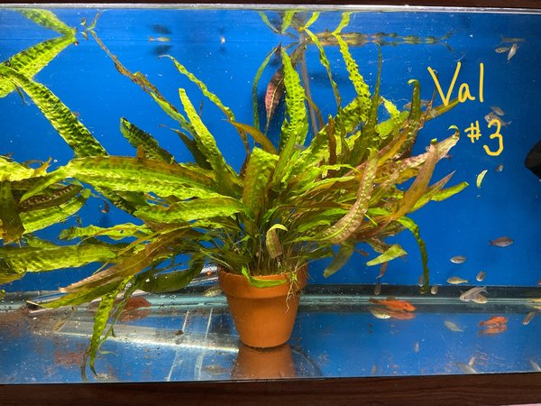 An unknown potted Cryptocoryne species that is easy to grow in my bare bottom tanks. This was started from a replanted runner in my fishroom and now takes up considerable space in a 16" x 48" 40 long tank. I don't do anything than adding a very occasional root tab and some occasional Flourish Excel to keep algae from starting. No fertilizing, no CO2, no special soil, only LED shop lights above the tanks. My water is very hard. The pot is 4" diameter. This plant is getting root bound. You could keep it as is, or you could split it up and replant in multiple new pots. Guaranteed to have snails, could have Red Laser Rainbow (Melanotaenia rubrivittata) or Snyder barb eggs, they really like laying them in these crypts.