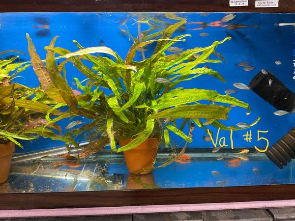 An unknown potted Cryptocoryne species that is easy to grow in my bare bottom tanks. This was started from a replanted runner in my fishroom and now takes up considerable space in a 16" x 48" 40 long tank. I don't do anything than adding a very occasional root tab and some occasional Flourish Excel to keep algae from starting. No fertilizing, no CO2, no special soil, only LED shop lights above the tanks. My water is very hard. The pot is 4" diameter. This plant is getting root bound. You could keep it as is, or you could split it up and replant in multiple new pots. Guaranteed to have snails, could have Red Laser Rainbow (Melanotaenia rubrivittata) or Snyder barb eggs, they really like laying them in these crypts.