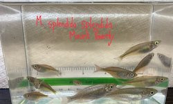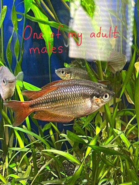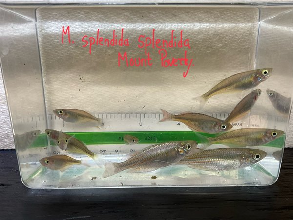 Melanotaenia splendida splendida " Mount Poverty " is a pretty and very hard to find rainbowfish. This is a BAP program donation. The donation will be three pair of young fish. The two lots in the auction are the only ones I have to sell. My only remaining fish of this species is an adult breeding group of eight that is on display in my dining room planted tank and I have no plans to breed them again.