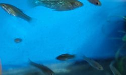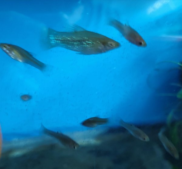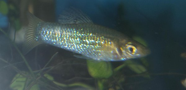 A very sparkly, wild-form livebearer. Most Limias are vegetarian but this species thrives on brine shrimp and other standard tropical feed. I did not separate fry from the parents, they seem to coexist peacefully.
