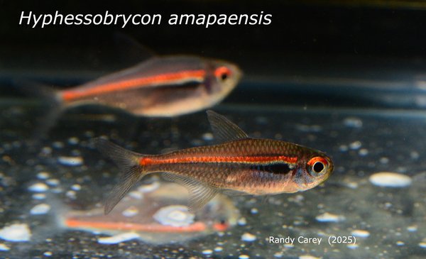 One of the new tetra species. Its conspicuous features include a bright/bold red glowing line with a black streak underlying the anterior of that line. The glow stripe is similar to that on the glowlight tetra, but to my eyes the bold red makes this species more desirable. This rare species currently sells for $15 each at Wet Spot (where I obtained my specimens). The females get noticeably more plump (in photo, male is in front with plump female in back), allowing me to isolate males from females. I have spawned these several times using a pair over a spawning grid. Once being reunited, my specimens spawn the next day. The percentage of fertilized eggs varied depending upon which male I used, and the hatchlings are on the smaller side.