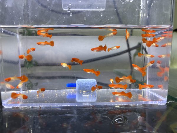 Fish being auctioned are 4 each, juvenile, and are from a 5/6 spawn. Picture is of a group of the guppies that are in this auction.