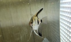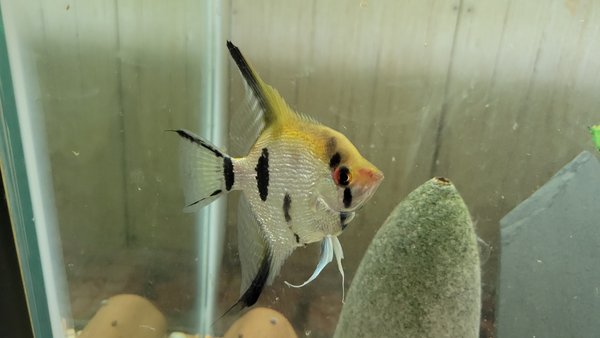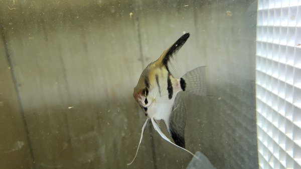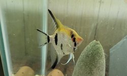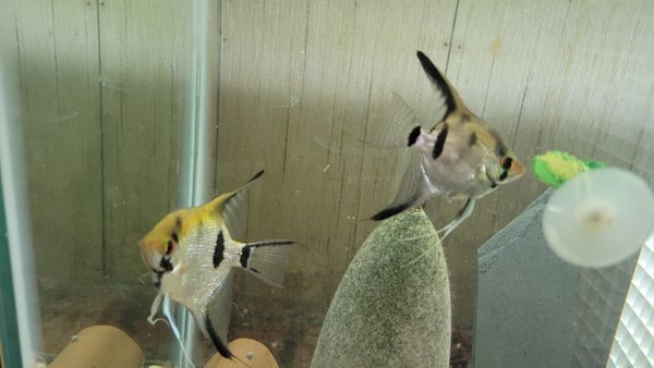 First time breeding pair (7/10/25) of short finned Silver/Ghost Hybrid Angelfish. The Dad (larger of the two) is pearl-scale.