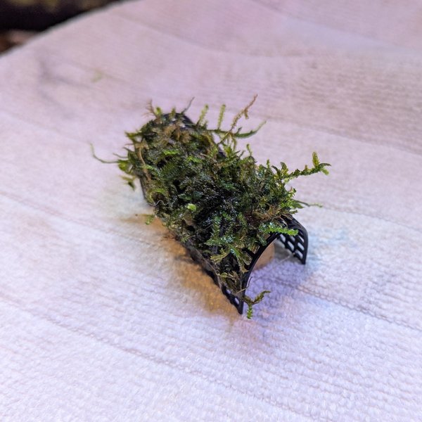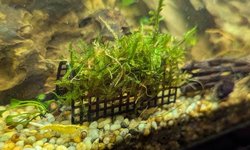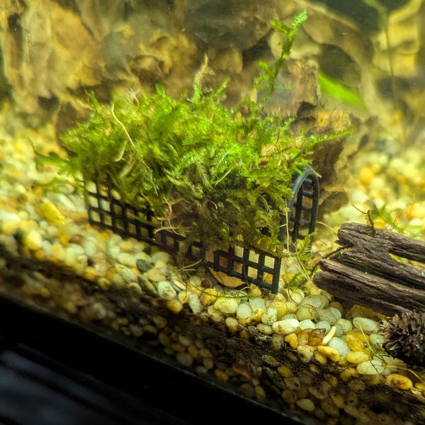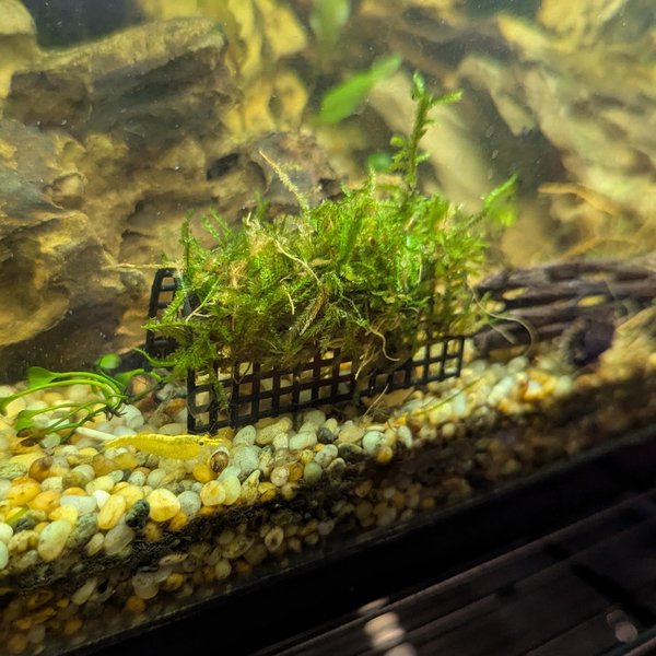 A little piece of cover I'm experimenting with for fry and shrimp. It's plastic mesh, covered in Christmas Moss, and weighed down with a couple small ceramic weights.