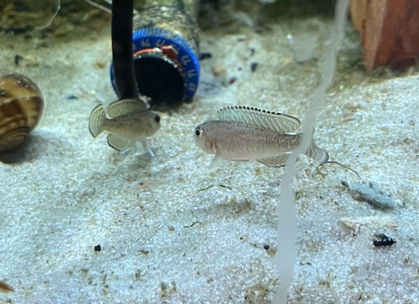 This is a breeding pair plus one of the Tanganyikan cichlid Lamprologus ornatipinnis kigoma. They are small guys, no more than 2.5" long. The three were in a 20g long tank when the third was kicked out (fortunately into another tank). Apparently, I should have given them more hiding places or a bigger tank. They prefer shells over caves, once they are comfortable, they will spend most of the time in the open. I've had them two months and they have spawned at least three times.