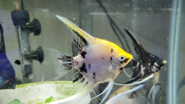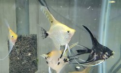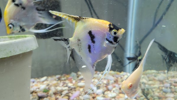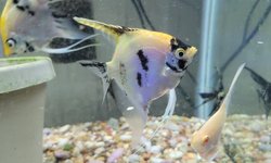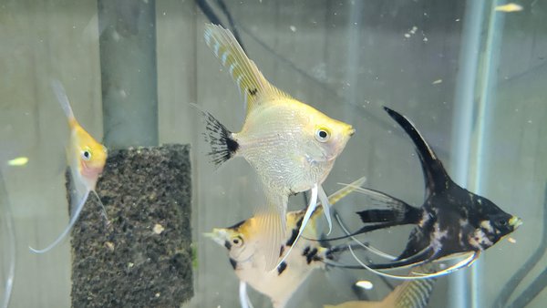 Three short finned adult Gold Marble Angelfish with body size around a dollar. The pearl-scale one is slightly smaller.