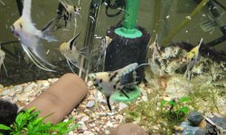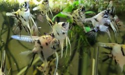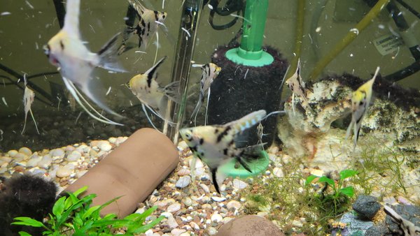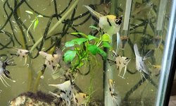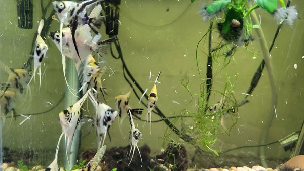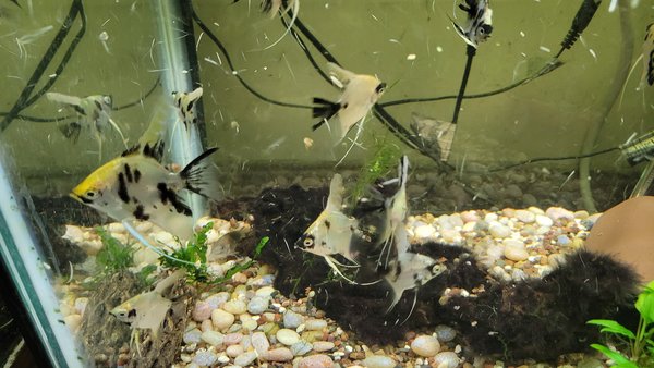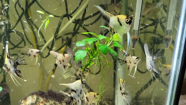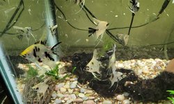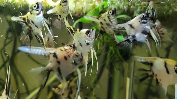A group of thirteen unsexed short finned Gold Marble Angelfish with body ranging from quarter to dime sized without fins.