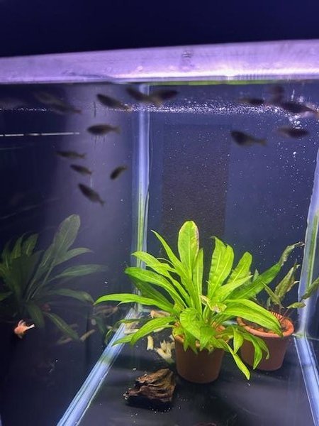 Bapping 5 neon dwarf rainbows bred in my fish room. Melanotaenia praecox, currently less than an inch in size. At this size treat them just like guppies and you will have no problem raising them up.
