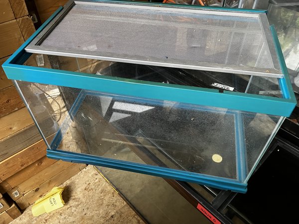 10 Gal tank with teal edging and a built in sliding mesh top. The tank looks to be in good shape. If it leaks, MAS will refund the purchase price.