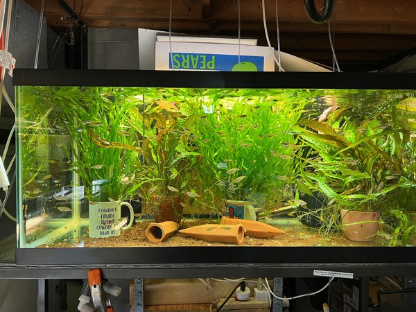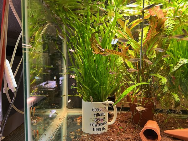 A repurposed coffee mug with a large amount an unknown Vallisneria species, probably spiralis, grown in my fishroom. You are bidding on just the white coffee mug in the photo. The other containers in the photos are in other listings. Use as-is or divide. The rootball easily slides out of the pot for replanting or dividing into additional pots. This species grows FAST in my hard water under LED shop lights without any supplements other than some occasional Flourish Excel to help keep algae under control, so it couldn't be much easier to grow. Nuisance snails are guaranteed to be included, any algae is incidental or there is none. The plants are coming from a 40 Breeder grow out tank with young non-spawning Rainbowfish.