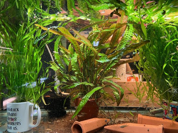 An unknown potted Cryptocoryne species including several runners that could be cut off and replanted too. These have been easy to grow in my bare bottom tanks. This was started from a replanted runner in my fishroom and now takes up considerable space in a 40 breeder tank. I don't do anything than adding a very occasional root tab and some occasional Flourish Excel to keep algae from starting. No fertilizing, no CO2, no special soil, only LED shop lights above the tanks. My water is very hard. The pot is 4" diameter. This plant is getting root bound. You could keep it as is, or you could split it up and replant in multiple new pots. Nuisance snails are guaranteed. The plant comes from a rainbowfish growout tank.