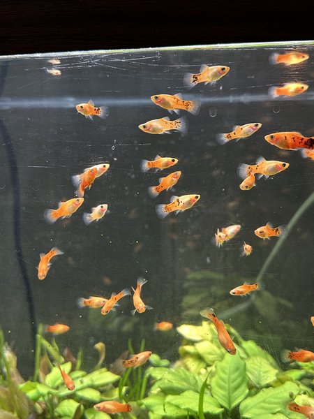 In this lot you are bidding on 12 juvenile platys of varying ages. I will be sure to include a mixture of males and females. They are the Pink Dalmation color variety.