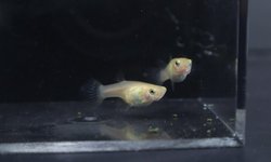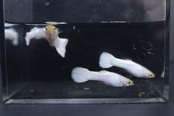 This lot is for 2 males and 2 females that come from my crossbreeding experiments to try and solidify a snow white guppy line. I embedded a youtube link of the whole project. These guppies come from cross 16 (males) and cross 18 (females) in those videos. I had very low numbers of females recently and so to keep the males paired, they will come with females from a different cross. The males are 100% snow white and the females are either 50% or 100% snow white. They are hard to tell apart. A 50% snow white female crossed with a snow white male will throw 50% snow white and 50% light red/pink. The last photo I added shows what those light red/pink guppies will look like.