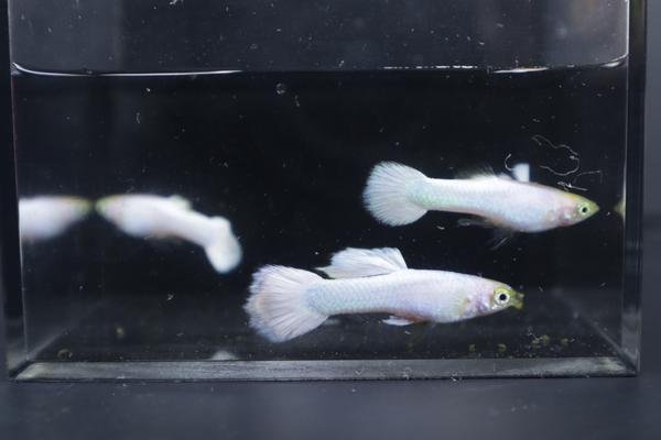 This lot is for 2 males and 2 females that come from my crossbreeding experiments to try and solidify a snow white guppy line. I embedded a youtube link of the whole project. These guppies come from cross 16 (males) and cross 18 (females) in those videos. I had very low numbers of females recently and so to keep the males paired, they will come with females from a different cross. The males are 100% snow white and the females are either 50% or 100% snow white. They are hard to tell apart. A 50% snow white female crossed with a snow white male will throw 50% snow white and 50% light red/pink. The last photo I added shows what those light red/pink guppies will look like.
