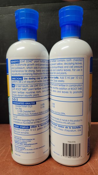 API LEAF ZONE plant fertilizer contains iron & potassium for colorful leaves and a vibrant planted aquarium. Product is formulated for rapid absorption through plant leaves, and works to promote aquarium plant growth. For best results, use API LEAF ZONE plant fertilizer in combination with API ROOT TABS plant fertilizer. Keeping an aquarium garden has never been so simple!