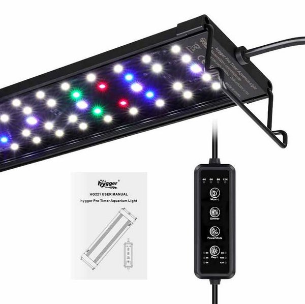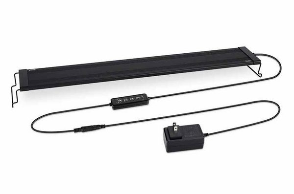 An LED lighting system that can simulate natural sunrise-to-sunset transitions in aquariums. The programmable timer has preset 4 moonlight timer options, 6 daylight timer options, and a 15-minute gradual transition to prevent sudden light changes. The light turns on and off slowly over 15 minutes for freshwater tanks 12" - 52". The light is 36" in length.