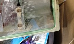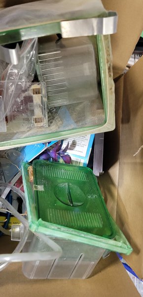 My brother in-law passed away recently and I inherited his fish stuff. For a man with a couple of tanks he amassed a HUGE amount of fish stuff. Much more than I could use so I'm parceling it out. This box contains filter materials, ph test kit, plastic plants plus who knows what else lurks at the bottom?