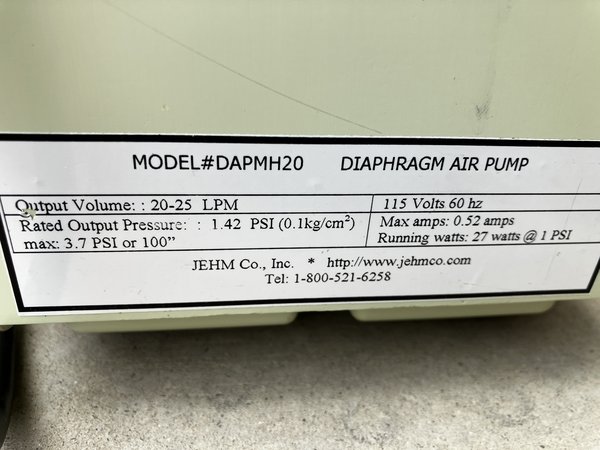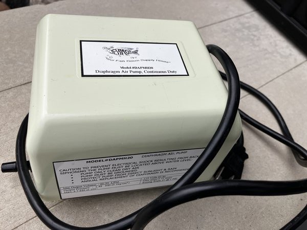 Brand new air pump from JEHMCO, which makes the best pumps in the industry. A quiet yet powerful (22W) central air pump in an all metal housing with exceptionally long diaphragm life, rated for 12 - 20 outlets (1/8 NPT outlet port). Retails for $109. Minimum set at $75.