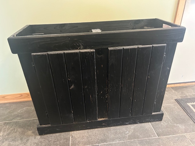 Wooden aquarium stand, painted black, for a 45-gallon tank. Dimensions 28H x12W x36L, in inches.