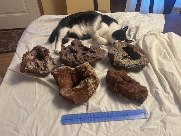 5 red lava rocks, holey. Sizes range from 4 x 7 inches to 6 x 10 inches.