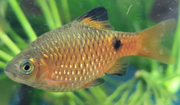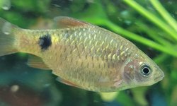 The rosy barb is an active, peaceful species well-suited for a community aquarium. It is considered one of the hardiest barbs, undemanding and beautiful, and most impressively colored during the mating period. It can be kept together with other small fish but can be aggressive toward other fish and nip their fins. They will eat most foods provided to them. They are best kept in groups of 5 or more in an aquarium with a length of at least 76 cm (30 in). They usually reach a maximum size of 10.2 cm (4.0 in). Using a dark-colored gravel will show off the color of the fish.