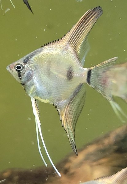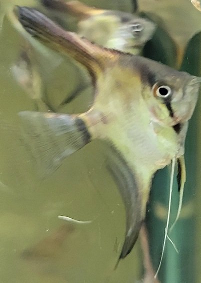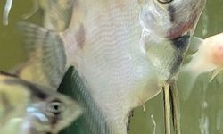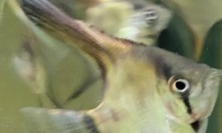 A lot of six Hybrid Angelfish whose parents were a Philippine Blue female and an Albino male. Body size without fins will be dime to nickel.