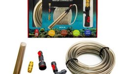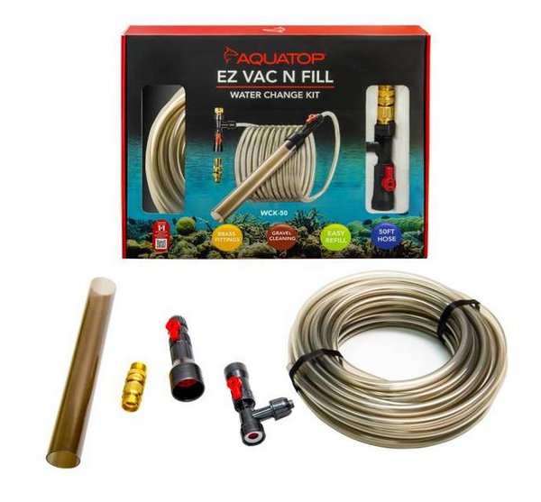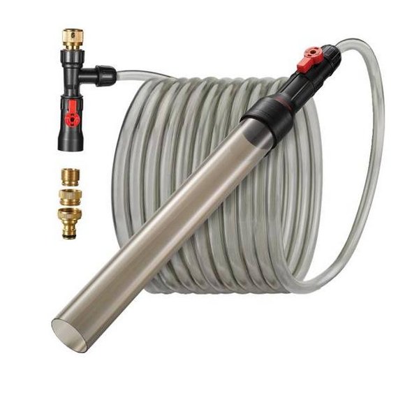 Heavy duty aquarium siphon with 50' PVC hose to reach the drain or outside the house. Has filling mechanism as well. Uses heavy brass connectors for easy connection and disconnection.
