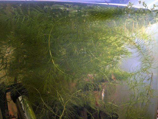 A large fistful of hornwort that I have free floating in a small tank. As hornwort has a habit of doing, it is taking over the tank and I need to get rid of some of it.