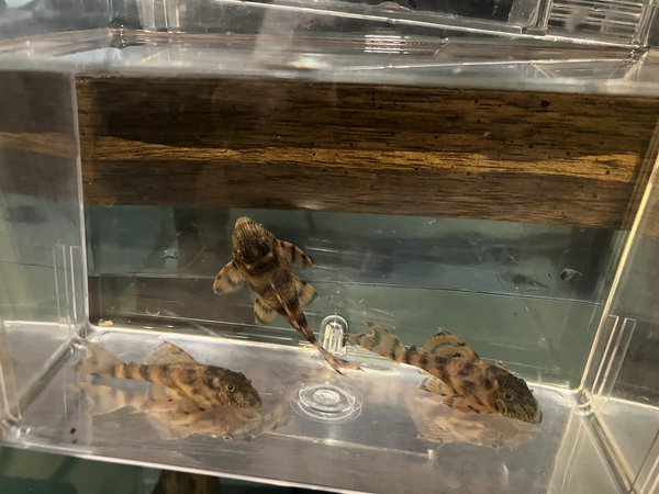 Easily bred plecostamus with red highlights in the tailfin. This fish is 1.5" - 2" long and will grow to 4.5" at full maturity. Fed with algae wafers, VibraBites and BugBites. Likes pleco caves.