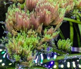An aquatic moss that hitchhiked into one of my tanks. It's growing about 1" tall on the surface of an unheated tank with hard water, low light, and liquid fertilizer. It's very buoyant, relatively slow growing, and will cover the entire surface of your tank if you let it. Looks kind of cool, but annoying when feeding fish from the surface.