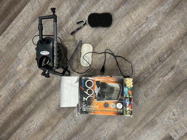 Finnex PX-360 compact canister filter is in good working condition. Fully functional and includes intake/outflow pipes, sponge, media basket, and power cord. You'll need to add new carbon when you use it. Great for planted tanks, shrimp tanks, or nano aquariums where you want quiet canister filtration without a large external filter.