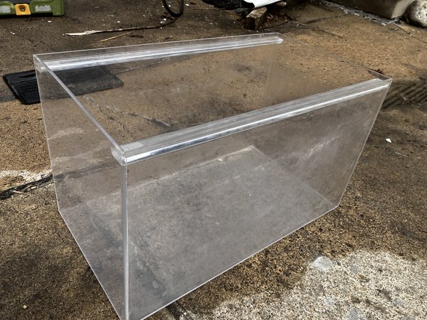 Used acrylic tank, 27" length x 15" deep x 16" high, with supporting elements at the top. Approximately 28 gal in volume.