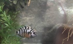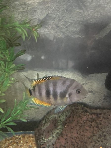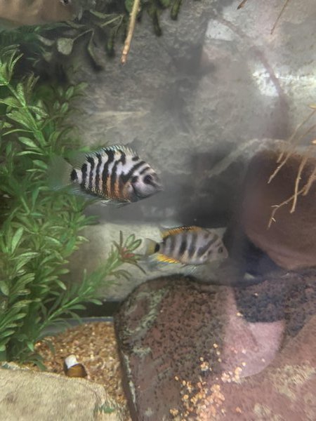 Parents bought from Tangled up in Cichlids. A yellow-orange convict type. Female has high contrasting breeding colors.