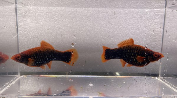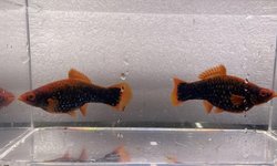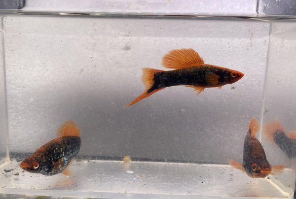 2 high fin males, 4 standard fin females. Females gravid with fry, descended from my Red Alpha line