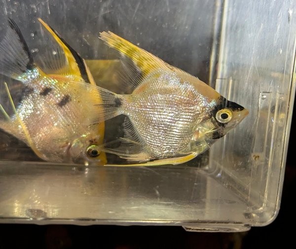 PEARLSCALE PLATINUM KOI ANGELFISH, Pterophyllum scalare, group of 3 juveniles, unsexed, quarter+ size, locally bred (pearlscale becomes more developed with age)