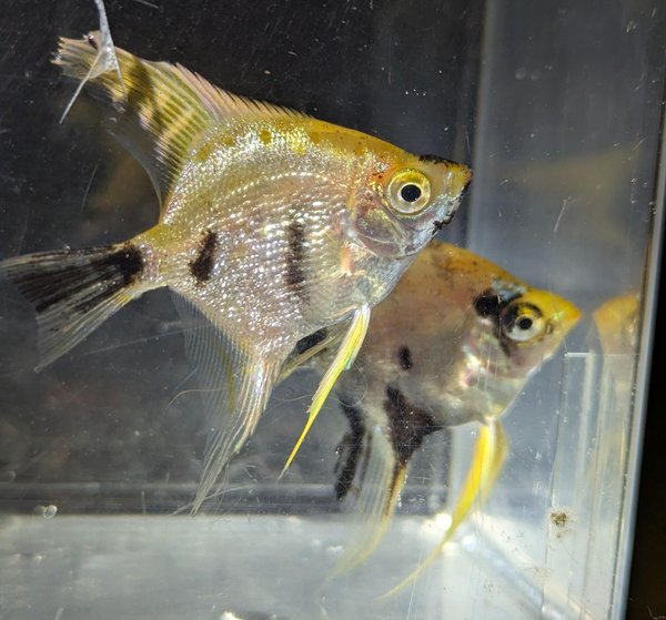 PEARLSCALE PLATINUM KOI ANGELFISH, Pterophyllum scalare, group of 3 juveniles, unsexed, quarter+ size, locally bred (pearlscale becomes more developed with age)