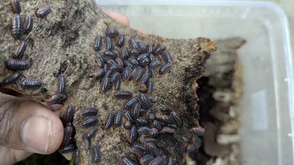Terrestrial "rolly polly" isopods sporting black body with red skirt and yellowish to white dots along the back.
