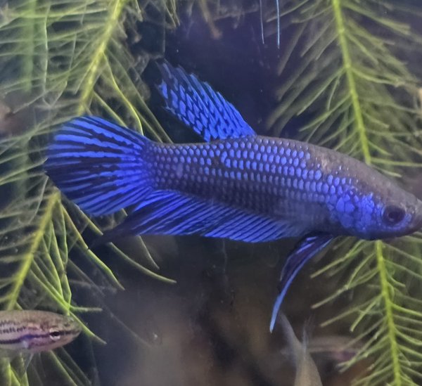 Deeeep royal blue. Beautiful bubble nester. Can take hard water. Even brackish.