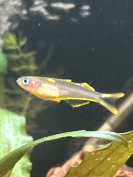 4 juvenile Forktail Blue-Eye Rainbowfish. Peaceful and active fish who love to show off their "pom-poms" as they swim. In the presences of females, the males will spar in a circular dance and display their vibrant fins. This group includes 2 females and 2 males.