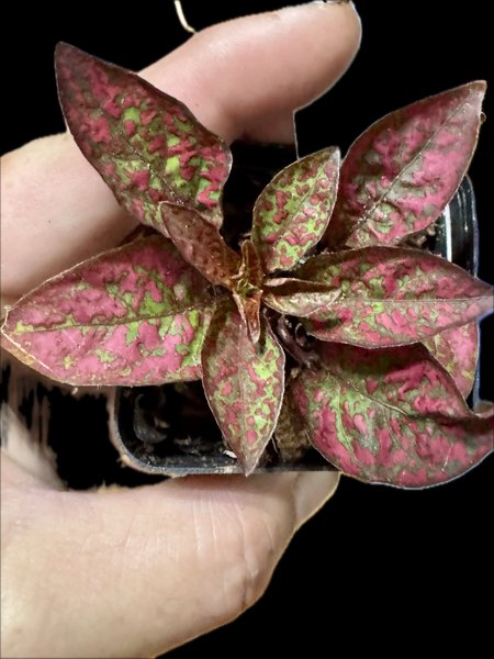 Colorful foliage plant with red leaves and pink spots; can grown out of the top of tank or in a terrarium