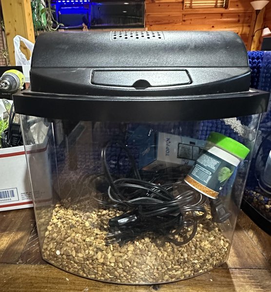 Lightly used top fin 2.5 gallon mini bow with filter, heater, led light, gravel and Beta food.