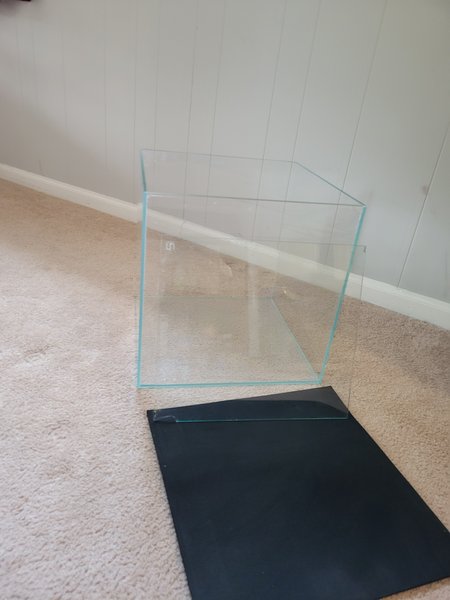 Rimless aquarium with bottom pad and lid with 2 corner chips on lid.