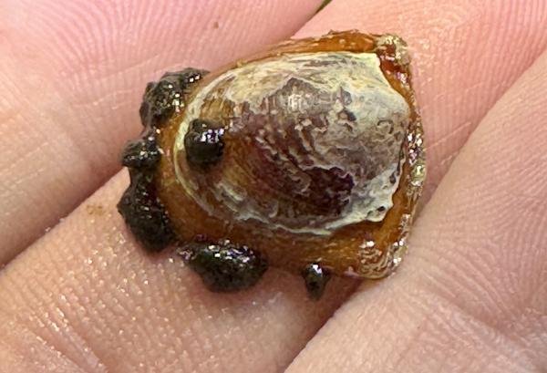 This snail is a unique shape with only one side of a shell that is shaped like the Batman symbol.