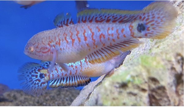 The Peacock Gudgeon (Tateurndina ocellicauda) is a beautifully colored nano fish from Papua New Guinea, featuring a shimmering blue body with yellow fins and vibrant red markings. Males display a distinctive spot near the tail and develop a slight forehead hump when mature. Peaceful and full of personality, they do well in small community or breeding setups with plenty of hiding spots. A dazzling and easy-to-keep species that quickly becomes a tank favorite.