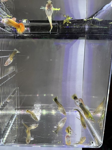 A group of 10 healthy, active juvenile guppies from my homebred colony. These young guppies are a mix of fancy and snakeskin types, with a variety of tail shapes and developing colors. Raised in a community tank on quality flake, baby brine, and vegetable-based foods. (Actual pic of the lot)
